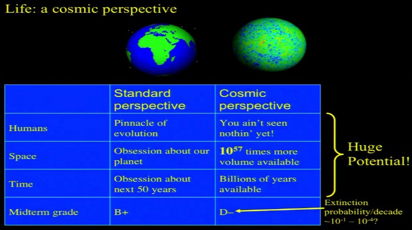 And I figured, well, you know, I asked some friends. They said, maybe a B-plus. You know, we’ve done a lot of dumb stuff, a lot of close calls like the Cuban Missile Crisis, but we’re still here, so maybe a B-plus. But from a cosmic perspective actually, I really have to give a D-minus. Even though, as Theodore can certify, that’s not an allowed grade at MIT. D is the lowest—above F—there is. Why a D-minus? Because from a standard perspective a lot of people feel that humans are the pinnacle of evolution, this is where we got this planet, we’re limited to it. Some people are very obsessed about the next 50 years, maybe the next election cycle even. Right? So, if we wipe ourselves out in 50 years maybe it’s not such a big deal. From a cosmic perspective that is completely retarded. We ain’t seen nothing yet. It would be completely naïve, in a cosmic perspective, to think this is best, this is as good as it can possibly get. We have 10 to the power 57 times more volume at our disposal for life out there. We don’t have 50 years. We have billions and billions of years available. We have an incredible future opportunity that we stand to squander if we go extinct or in other ways screw up. People argue passionately about what the probability is that we wipe out in any given year. Some might say it’s one percent. Some might say it’s much lower—a percent of a percent. Some might say it’s higher—10 percent. Any of these numbers are just completely pathetic. If it’s one percent you expect maybe we’ll last for 100 years. That’s pretty far from the billions of years of potential we have there, right? So, come on, let’s be a little more ambitious here. Let me just summarize in one single slide why I think it’s so pathetic, how reckless we are being stewards of life. Namely this slide.